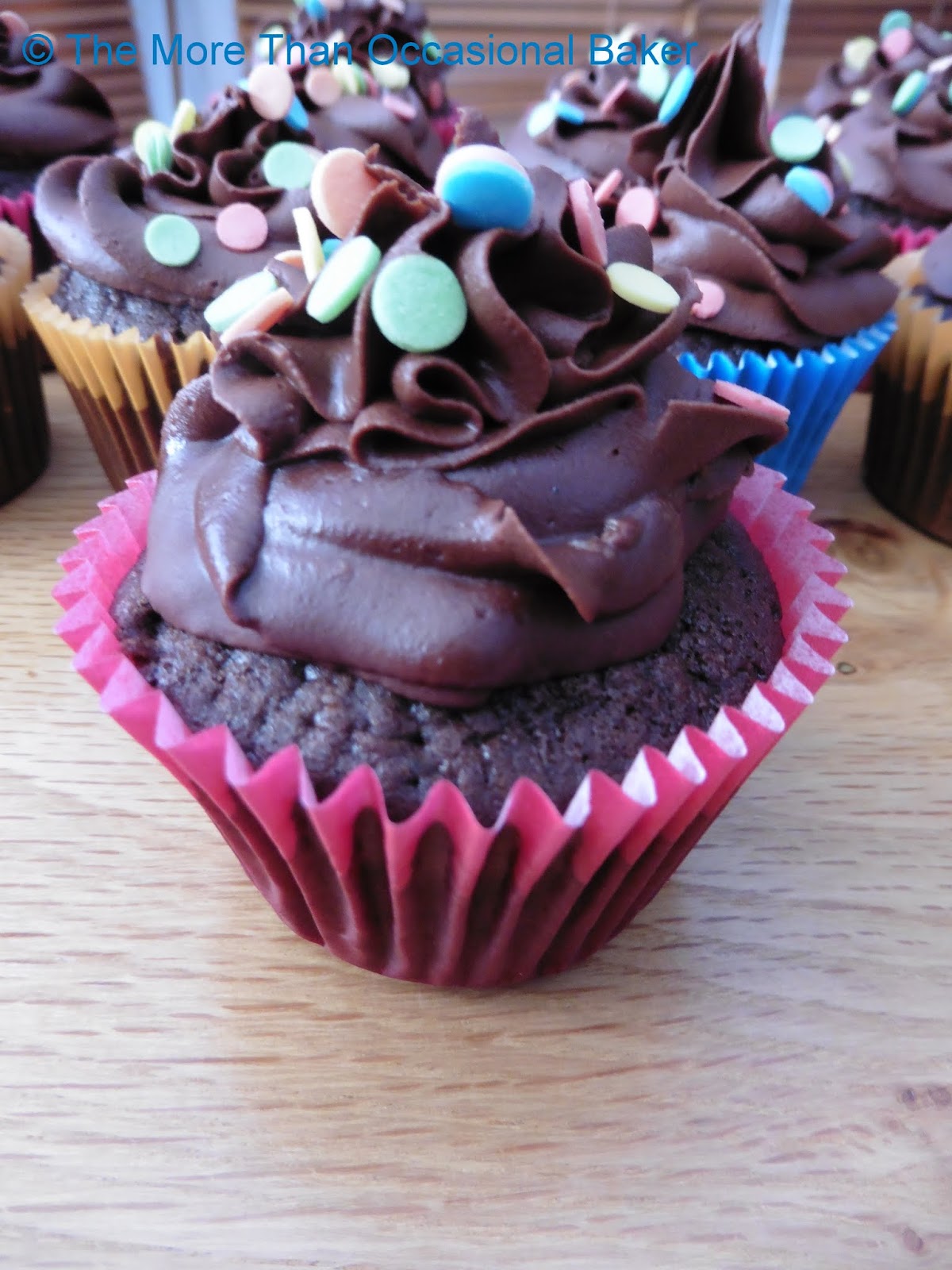- Pipe the chocolate icing on top of the chocolate cupcakes and decorate with sprinkles.