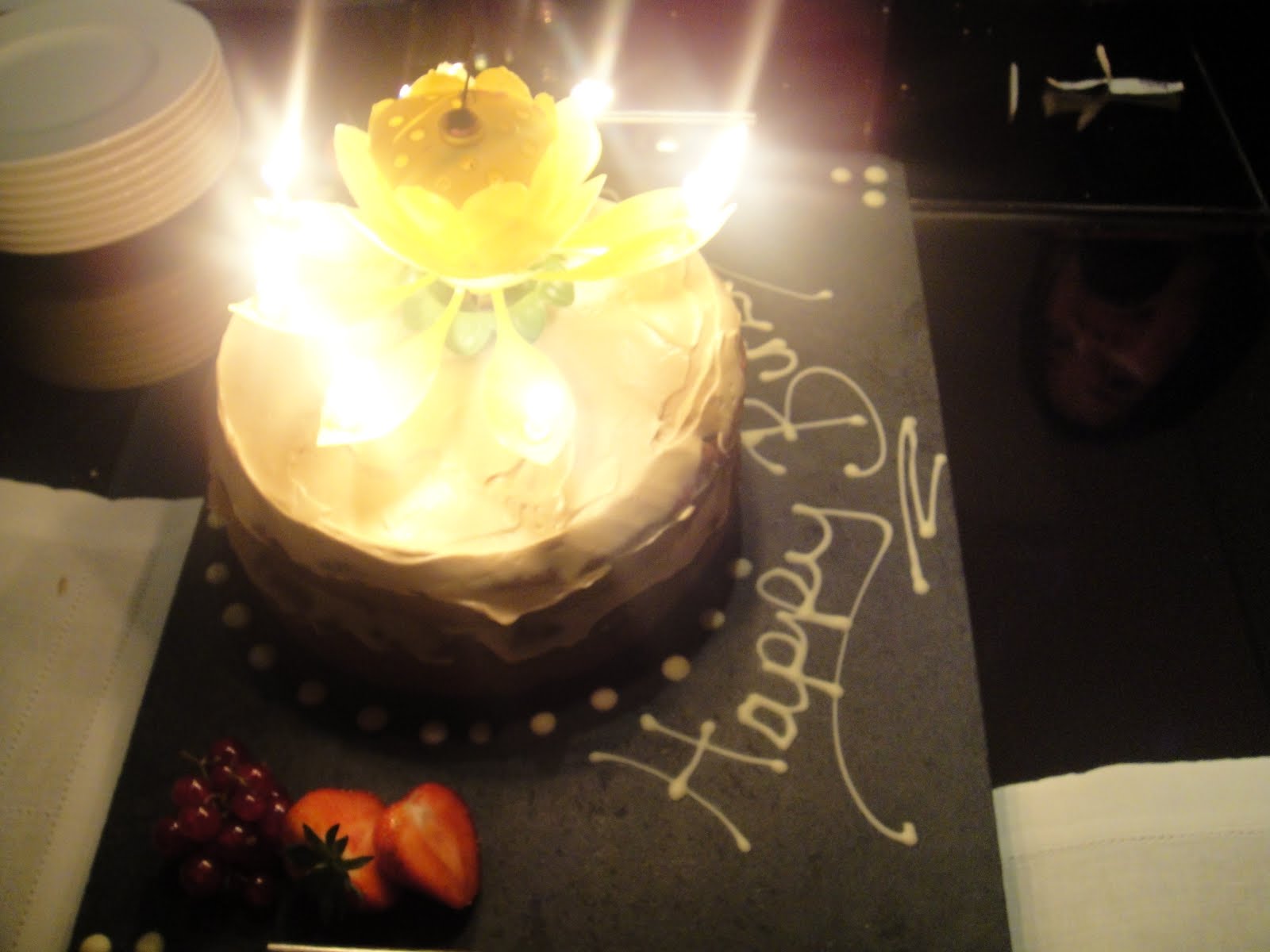 We went to a lovely restaurant to celebrate the birthday and they were kind enough to decorate the plate with writing and fruit as shown above. I bought a really fancy candle after having seen it on the