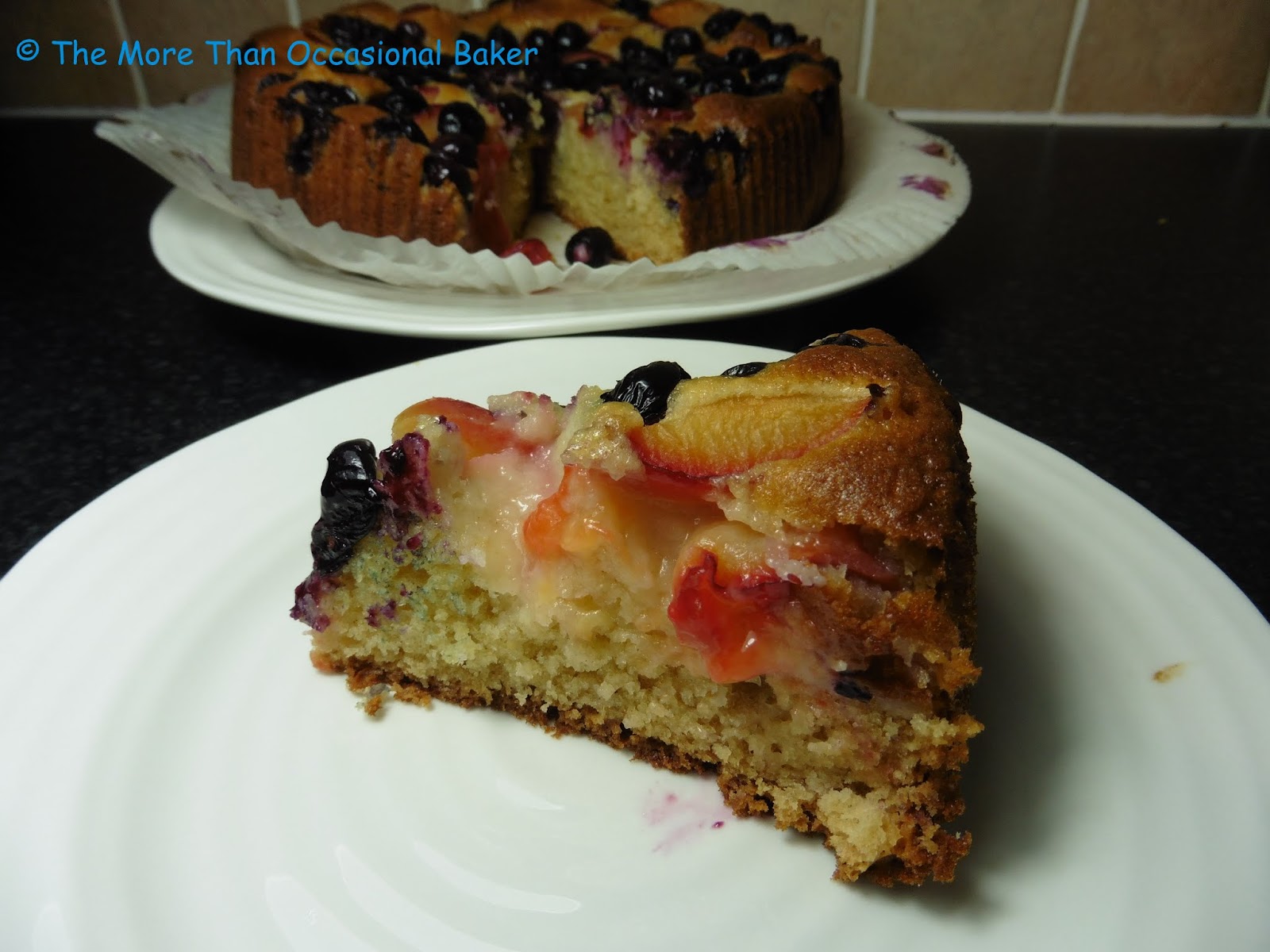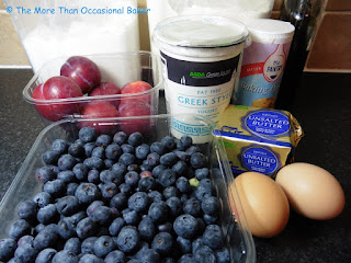 When Caroline announced that this month's AlphaBakes letter is 'Y',I immediately thought of yoghurt. I love baking with yoghurt and tend to use it in muffins and banana bread. I found this great recipe online for a Peach and Blueberry Greek Yoghurt Cake so I decided to give it a go. Plums were on sale in the supermarket so I used plums instead of peaches and it worked beautifully. I'm sure nectarines or even pears would work well too. The cake is really colourful and visually appealing. The sponge is light and the added fruit on top makes it feel almost healthy.