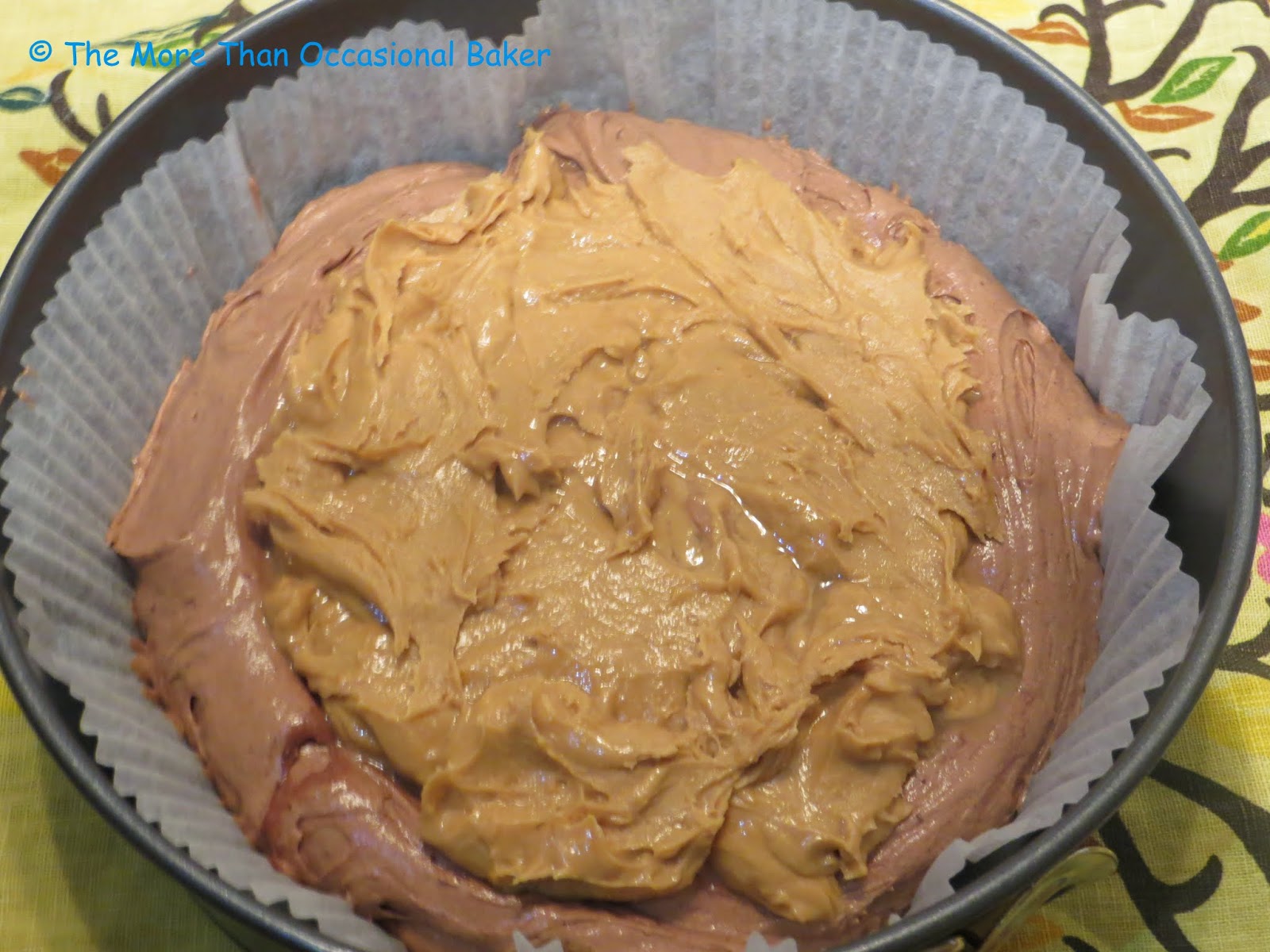 - Spread the peanut butter layer on top of the brownies and use a fork to gently swirl it through.