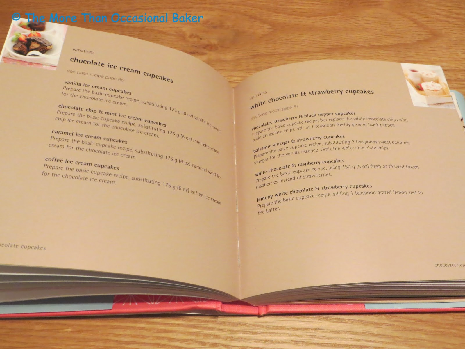 All the cupcake recipes fit onto 1 page with a one line summary followed by ingredient list and methods. The instructions are simple and succint. Most of the main recipes include a picture but there isn't a picture for each recipe. Each recipe has variations listed on a separate page. For example, these chocolate orange cupcakes pictured below are a 'main recipe'