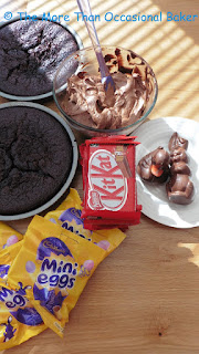 Can you believe it's a week till Easter? I know it's early this year but it still seems to have come out of nowhere. I have great plans for Easter baking but I'm not sure if I'll get round to all of it! Thankfully I have an Easter themed cake to share with you today and will definitely be baking a few more in the next week! This cake is a chocaholic's dream and is sure to impress both adults and children. It has a light chocolate sponge sandwiched with chocolate buttercream, surrounded by Kit Kats and is topped with mini eggs and a chocolate bunny and a chocolate duck made from Belgian chocolate. I bought the chocolate figures from my recent trip to Belgium and they taste as good as they look. For my cakes next week I'm going to use Lindt chocolate bunnies, Cabdury milk bunny and a Cadbury Chick.